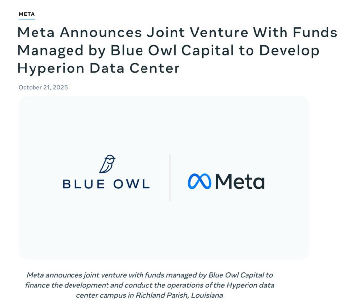 智东西10月22日消息,10月21日,Meta与国际资产管理公司Blue Owl Capital达成了一项价值270亿美元(约合人民币1923.67亿元)的融资协议,用于开发位于美国路易斯安那州的Hyperion数据中心项目。该投资是Meta迄今为止最大规模的私募资本交易。